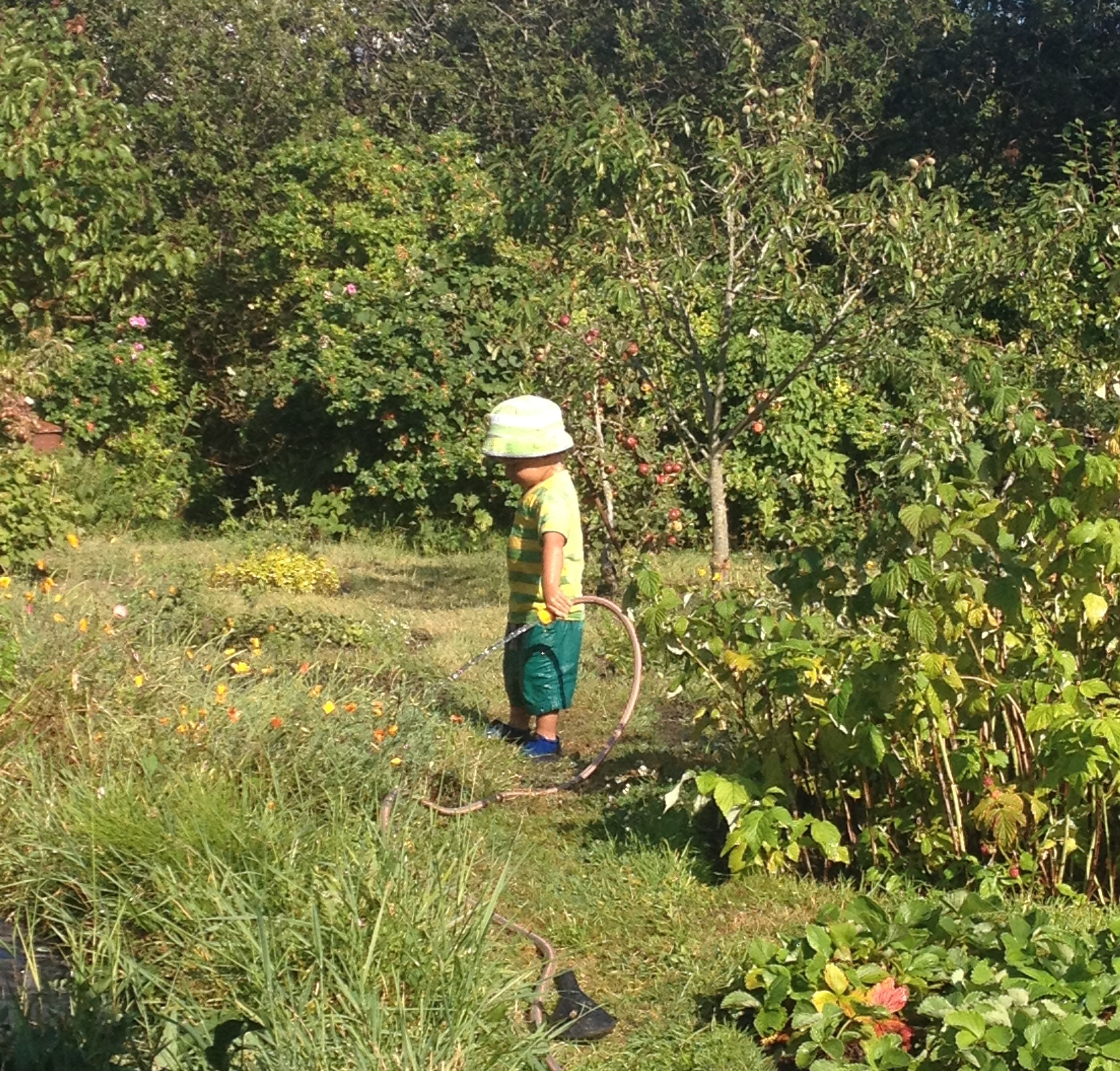 My friend’s son spends much of his time with his grandmother, quintessentially in her allotment (a fab British tradition of community based gardening), watering the many fruits, vegetables, berries and flowers that his grandmother labours over. He knows the lay of the land, his “ga ga” (garden), grabbing the hose and watering his favourite apple tree with ease and joy. He enjoys the natural pleasures of strawberries, raspberries, blackcurrants, and even gooseberries! He is learning when to wait and when to harvest, discovering how life is sweet with changing seasons and sharing the joy of plucking fruit direct from shrub to mouth, often with purple finger tips.